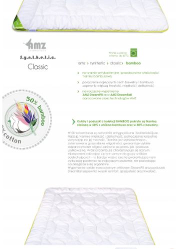 Włókna bambusa są naturalnie antygrzybiczne i bakteriobójcze. Nadają tkaninie miękkość i delikatność, jednocześnie korzystnie wpływając na jej trwałość. Tkanina jest szybkoschnąca - zbilansowana gospodarka wilgotności, gwarantuje szybkie odparowywanie wilgoci zarówno po praniu jak i podczas użytkowania. Włókno bambusa charakteryzuje się licznym mikroporami zaliczając się tym samym do grupy włókien oddychających - to bardzo ważna cecha gwarantująca nam cyrkulację powietrza na najwyższym poziomie, nie pozwalając na przegrzanie się organizmu. Wypełnienie poduszek nowoczesnym włóknem DreamBall zapewnia wysoki komfort, sprężystość oraz trwałość.