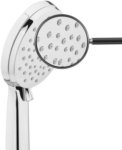 Trwała warstwa błyszczącego chromu jest odporna na łuszczenie. Dzięki silikonowym dyszom usunięcie osadzającego się kamienia nie będzie stanowić problemu, a ich zróżnicowana średnica i odpowiednie rozmieszczenie gwarantują uzyskanie optymalnego strumienia wody. Dodatkowym elementem podkreślającym elegancję Twojej łazienki jest chromowana powierzchnia głowicy.