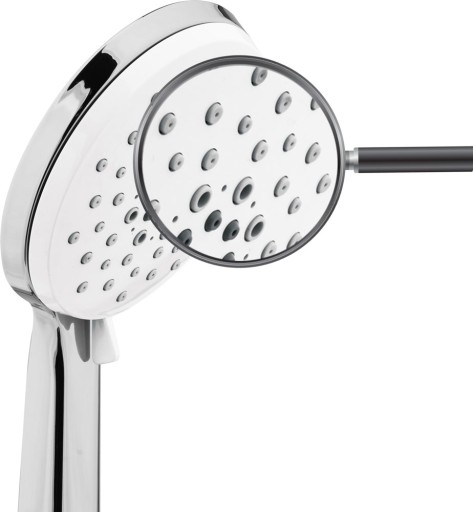 Trwała warstwa błyszczącego chromu jest odporna na łuszczenie. Dzięki silikonowym dyszom usunięcie osadzającego się kamienia nie będzie stanowić problemu, a ich zróżnicowana średnica i odpowiednie rozmieszczenie gwarantują uzyskanie optymalnego strumienia wody. Biała powierzchnia głowicy sprawi, że zacieki będą zupełnie niewidoczne.