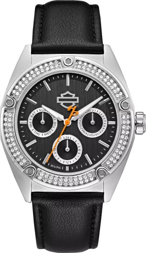 Ozdobiony 110 kryształami Swarovski® zegarek z czarną tarczą ozdobioną logiem Bar & Shield Harley-Davidson na godzinie 12. Pomarańczowy sekundnik posiada charakterystyczną przeciwwagę w formie liter HD. Koperta wykonana ze stali nierdzewnej, spięta czarnym, skórzanym paskiem z trzyczęściowym zapięciem na sprzączkę.