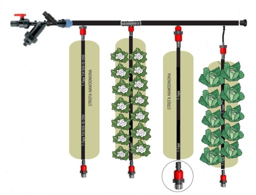 Zastosowanie: linia przeznaczona do nawadniania upraw takich jak: tuje, porzeczki, kapusta, maliny, pomidory, bukszpany, aronia, papryka, jeżyny, borówka, żywopłoty i inne rośliny w uprawie.