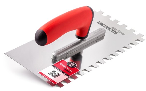 Stalowa paca nierdzewna marki COMENSAL z profesjonalnej linii BRAVO przeznaczona do rozprowadzania klejów samorozpływnych, grubowarstwowych i odkształcalnych na płytkach podczas prac glazurniczych oraz wykonania na nich bruzd, które gwarantują lepszą przyczepność płytki do podłoża.