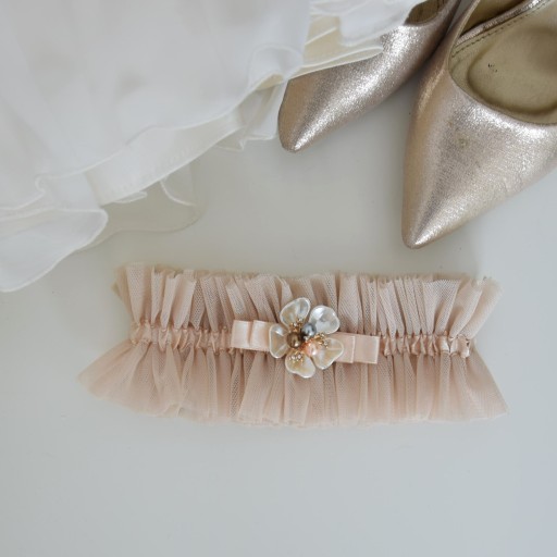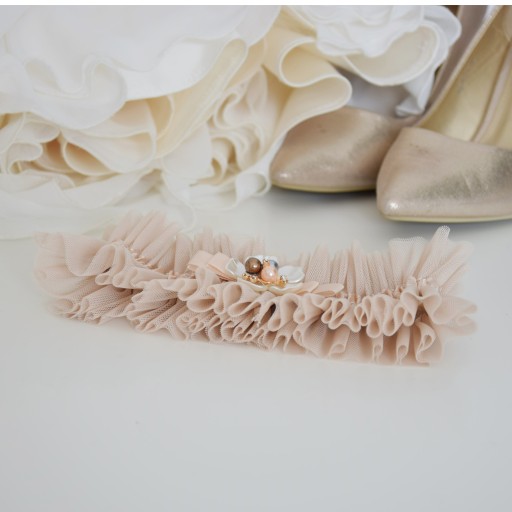 Nasza podwiązka ślubna w kolorze BEŻU z pięknymi zdobieniami, satynową wstążką i pięknie prezentującym się tiulem na pewno trafi w kolor przewodni Twojego wesela .