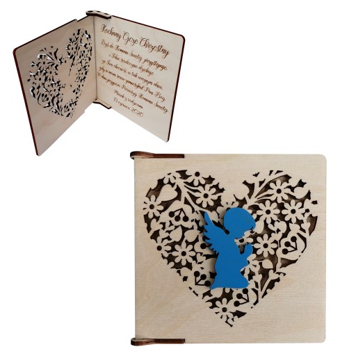 Podziękowanie wykonane jest ze sklejki o grubości 3mm. Napisy dedykacji są grawerowane laserem. Aniołek jest malowany farbą akrylową.