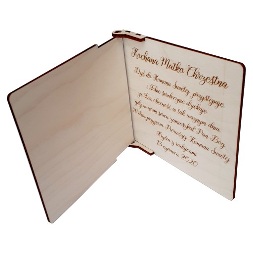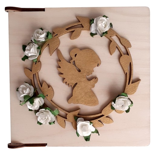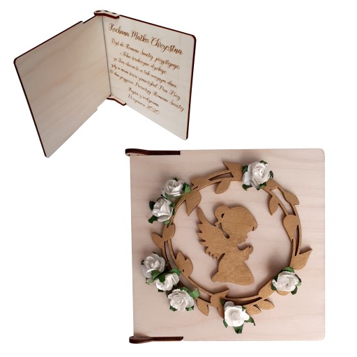 Podziękowanie wykonane jest ze sklejki o grubości 3mm. Napisy dedykacji są grawerowane laserem. Aniołek i wianek są malowane farbą akrylową.