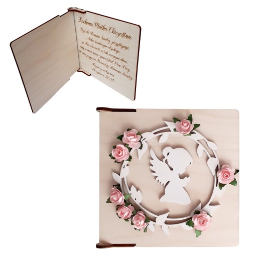 Podziękowanie wykonane jest ze sklejki o grubości 3mm. Napisy dedykacji są grawerowane laserem. Aniołek i wianek są malowane farbą akrylową.