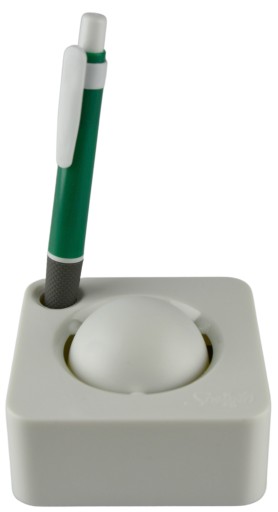Wykonany z tworzywa sztucznego okrągły pojemnik z magnetyczną obrotową kulką ułatwiającą wydobycie spinaczy ze środka pojemnika.