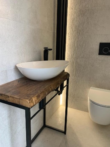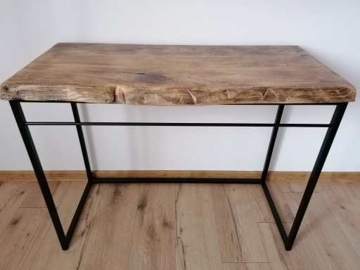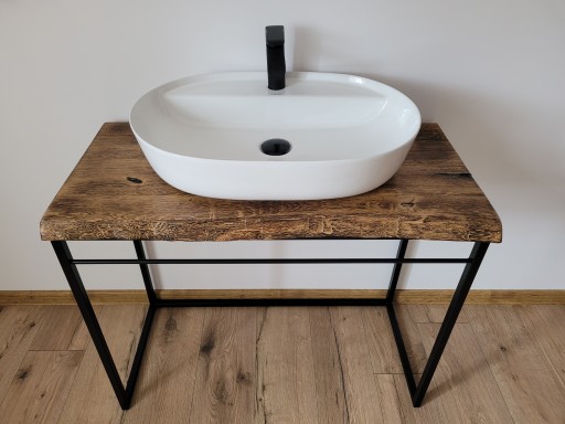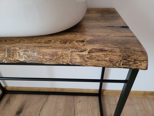 Przedmiotem sprzedaży jest metalowa konsola z relingiem na ręczniki i blatem z litego drewna dębowego o grubości 40mm. Oflis blatu jest nieregularny.