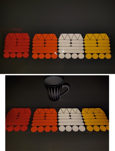 Zestaw wykonany z Niemieckiej Foli ORALITE stosowanej w produkcji znaków drogowych. Folia posiada w swojej strukturze system kulek szklanych zatopionych w transparentnej masie plastycznej. Gładka powierzchnia zewnętrzna zapewnia odporność folii na zarysowania i uderzenia oraz wykazuje bardzo dobre właściwości zadrukowywania.