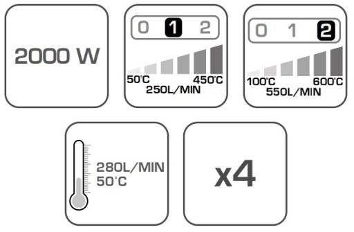 - chłodzenie: 280 l/min / 50°C – po zakończeniu pracy automatycznie uruchamia się tryb chłodzenia, który ostudza grzałkę dzięki czemu znacznie wydłuża się żywotność urządzenia