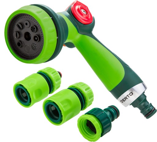 Zestaw z pistoletem zraszającym, złączkami jednomateriałowymi, przyłączem do kranu VERTO (nr ref. 15G712). Zestaw składa się z 4 elementów: zraszacz z płynną regulacją strumienia 8-funkcyjny, złączka przelotowa 1/2", złączka stop 1/2", przyłącze do kranu 1/2".