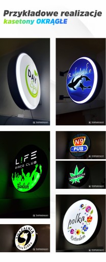 Nasze kasetony świetlne OKRĄGŁE składają się z dwóch elementów z profilu kasetonowego wygiętych pneumatycznie. W ofercie posiadamy kasetony o średnicach 50, 75 i 100 z ramą 10cm oraz 100, 120 i 150 z ramą 14cm w wersjach jedno i dwustronnych. Inne średnice dostępne są przy minimum produkcyjnym 10szt.