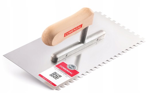 Stalowa paca nierdzewna z drewnianym uchwytem marki COMENSAL z profesjonalnej linii BRAVO WOOD. Do precyzyjnego i szybkiego nakładania klejów samorozpływnych, grubowarstwowych i odkształcalnych na płytkach podczas prac glazurniczych oraz wykonania na nich bruzd, które gwarantują lepszą przyczepność płytki do podłoża.