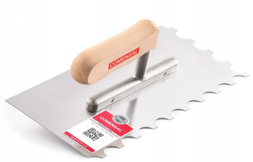 Stalowa paca nierdzewna z półokrągłym zębem i drewnianym uchwytem z profesjonalnej linii COMENSAL BRAVO WOOD przeznaczona do nakładania rzadszych klejów na płytki o dużych rozmiarach.
