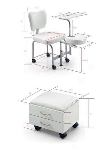 Wygodny i wyjątkowy taboret do pedicure Funny to krzesło z oparciem, regulowanym podnóżkiem, blatem na miseczki do manicure oraz dodatkowym siedziskiem z 2 szufladami na akcesoria. Funkcjonalny taboret kosmetyczny został obity wysokiej jakości eko skórą PU. Całość wykonana została na funkcjonalnych kółkach.