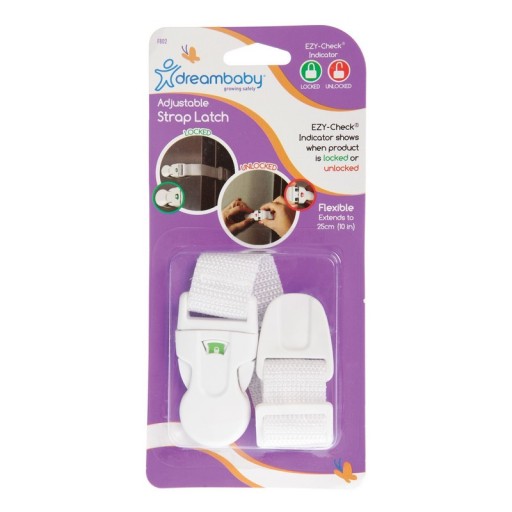 Regulowana taśma blokująca z wskaźnikiem EZY-Check firmy Dreambaby nadaje się do lakierowanych, laminowanych mebli, luster i lustrzanych szaf, lakierowanego drewna, drewna okleinowego, metalowych szaf, lodówek, zamrażarek. Z wskaźnikiem Ezy-check można łatwo sprawdzić, czy produkt jest odpowiednio zabezpieczony: jeśli widoczny jest kolor czerwony - produkt jest otwarty, jeśli zielony - zabezpieczenie jest zamknięte. Do montażu taśmy nie potrzebne są narzędzia ani śruby, taśma jest elastyczna, rozciąga się do 25 cm.