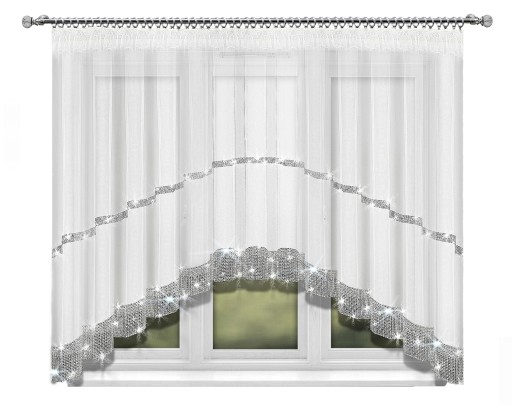 Oferujemy państwu firanę z białego woalu wykończona ozdobną taśmą z cyrkoniami, gotową do zawieszenia.