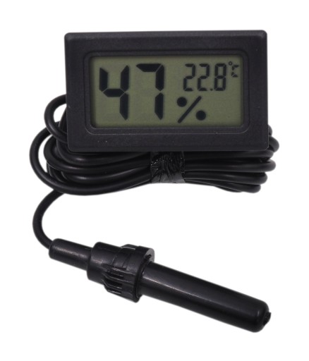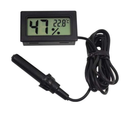 Elektroniczny, bardzo precyzyjny higrometr z termometrem wyświetlaczem LCD oraz sondą.