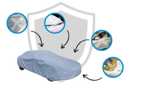 OCHRONA POJAZDU: przed działaniem promieniowania UV, szronem, przed zwierzętami chodzącymi po pojeździe, przed żywicą, przed ptasimi odchodami, przed olejami i innymi substancjami, przed kurzem, rdzą i matowieniem lakieru pojazdu, przed wysokimi oraz niskimi temperaturami.