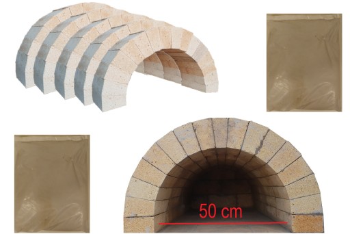 - KLINY 80 SZT. – KLINY SZAMOTOWE NA SKLEPIENIE PALENISKA (5 ŁUKÓW PO 16 KLINÓW - GŁĘBOKOŚĆ KOMORY ~ 115,8 cm x szer. 50 cm – OTWÓR POD KOMIN DO WYKONANIA WE WŁASNYM ZAKRESIE)