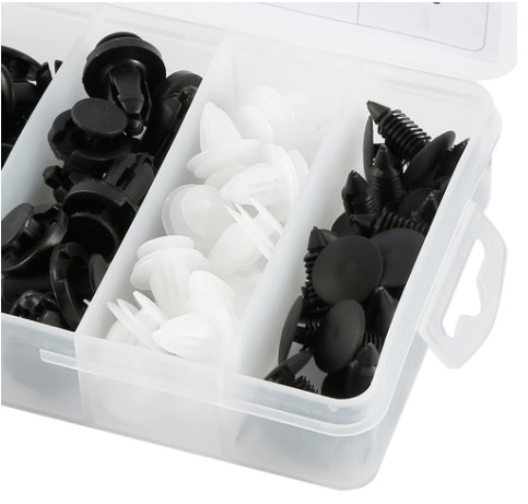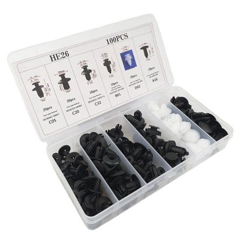Uniwersalny zestaw spinek, kołków, klipsów zatrzasków samochodowych do mocowania tapicerki, elementów plastikowych, zderzaków, czy uszczelek.