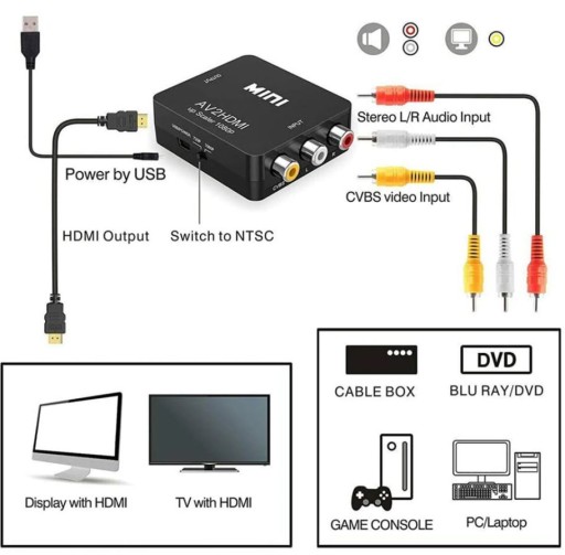 - Ten adapter z AV do HDMI pozwala na podłączenie urządzeń ze złączami analogowymi CHINCH do odbiorników wyposażonych tylko w cyfrowe wejścia HDMI.