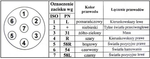 Poniżej tabela przedstawiająca łączenie przewodów patrząc od tyłu gniazda