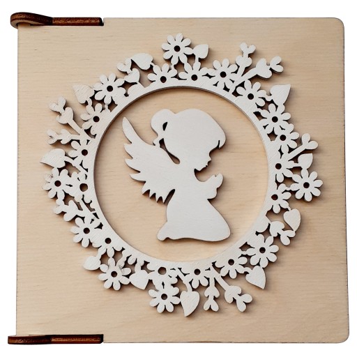 Podziękowanie wykonane jest ze sklejki o grubości 3mm. Napisy dedykacji są grawerowane laserem. Aniołek i wianek są malowane farbą akrylową.