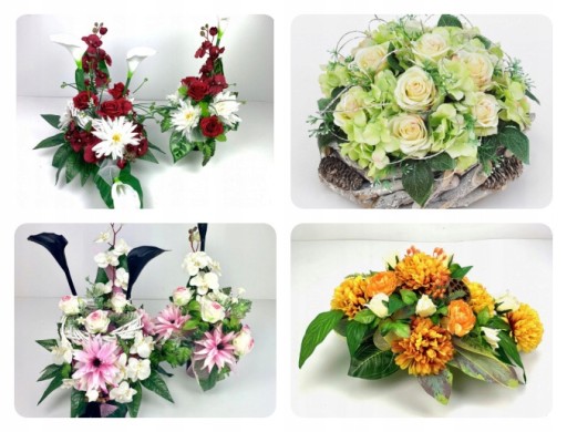 - Kwiaty: róża, hortensja, mieczyk, liście, sztuczne gałęzie, dodatki