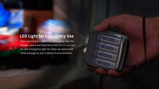 BC4 została wyposażona w białą diodę led, dzięki czemu możemu używać ładowarki jako podręcznej latarki, gdy zajdzie taka potrzeba. Aby skorzystać z tej funkcji w ładowarcę muszą znajdować się akumulatory. Uruchomienie trybu latarki w BC4 jest banalnie proste - wystarczy przytrzymać przycisk znajdujący się z boku ładowarki przez 2s!