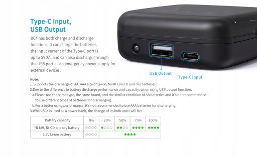 Ładowarka Xtar BC4 może służyć nam także jako powerbank. Posiada wyjście USB 5V 2A, które jest w stanie awaryjnie naładować jakieś urządzenie typu smartfon, odtwarzacz MP itp. Pojemnośc powerbanka zależy od umieszczych w niej ogniw. Co ważne z funkcji wyjścia USB można korzystać nawet używając baterii alkalicznych. Zalecane natomiast jest używanie akumulatorów Ni-MH / Li-ion 1.5V.