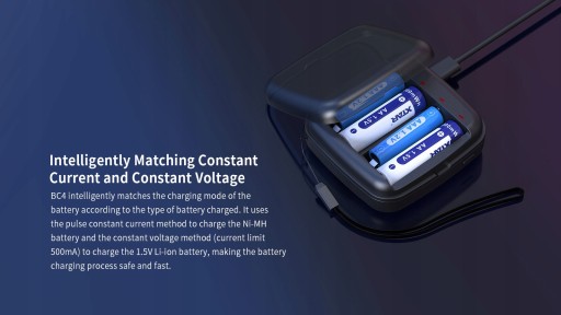 Ładowarka Xtar BC4 posiada zaawansowany procesor, który jest w stanie odróżnić rodzaj zainstalowanego w niej akumulatora. Dzięki temu w każdym gnieździe ładowarki możemy możemy ładować dowolny akumulator Li-ion 1.5V albo Ni-Mh. Dopracowany algorytm ładowania zapewni naładowanie akumulatora zawsze do pełna i w optymalnym, bezpiecznym dla danej chemii ogniwa sposobie.