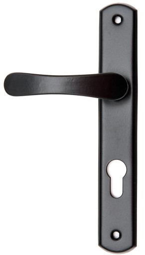 Klamka aluminiowa, malowana proszkowo na kolor czarny. Solidna klamka, często wykorzystywana jest w starszym budownictwie, do furtek i bram oraz w mniej wymagających pomieszczeniach.