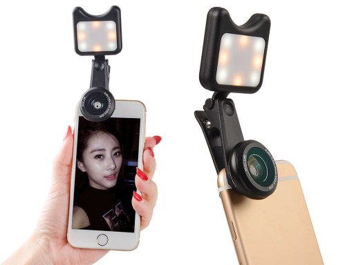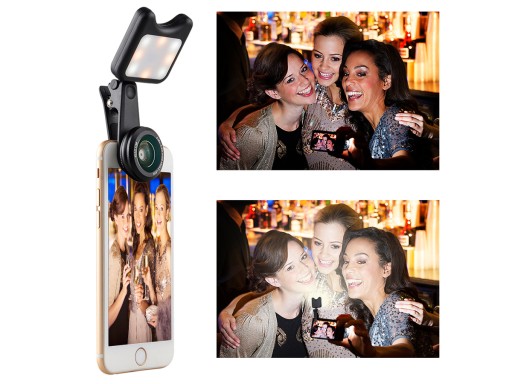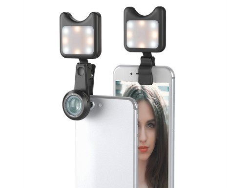 Lampka LED można w łatwy sposób zamontować zarówno na rancie telefonu (dedykowany uchwyt w zestawie) jak i na klipsie, na którym umieszczony jest obiektyw. Lampka LED doświetla zdjęcia, umożliwiając wykonanie wyraźnego zdjęcia zarówno w ciągu dnia jak i nocy.