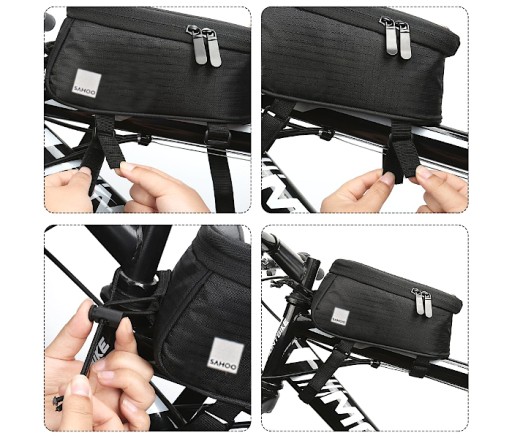 Mocowana do ramy za pomocą dwóch wytrzymałych pasków na rzep oraz do kierownicy za pomocą ściągacza.