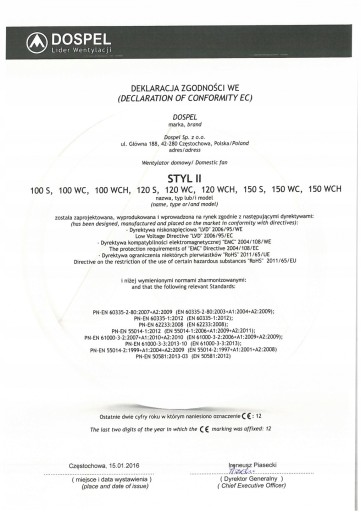 CERTYFIKAT ZGODNOŚCI - WENTYLATOR Dospel Styl II 120 S Standard