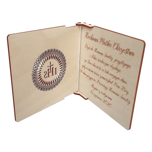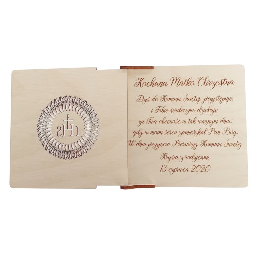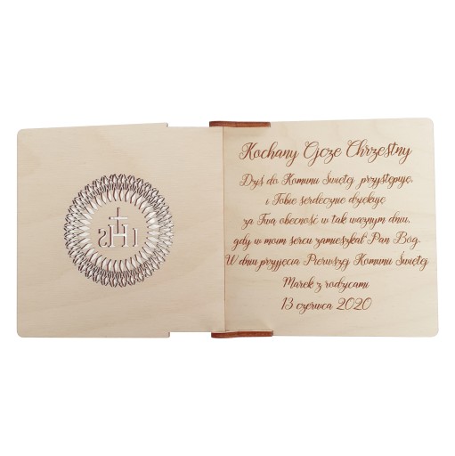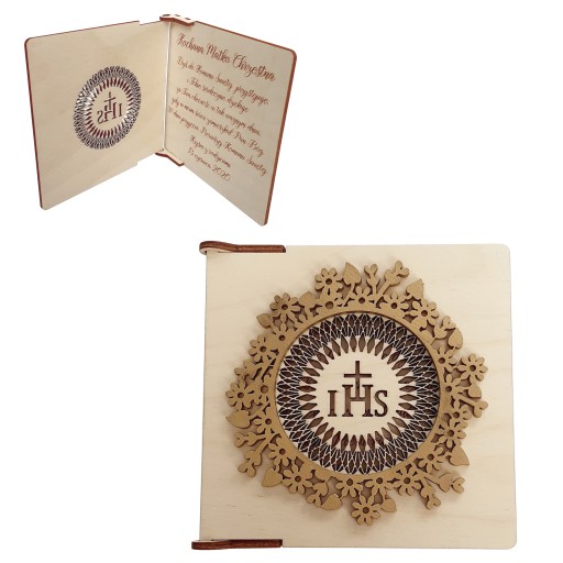 Podziękowanie wykonane jest ze sklejki o grubości 3mm. Napisy dedykacji są grawerowane laserem. Wianek jest malowany farbą akrylową.