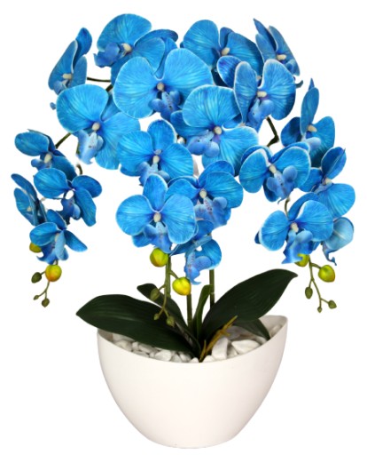 Kompozycja wykonana w plastikowej, połyskującej donicy. Model składa się z trzech silikonowych pędów storczyków oraz gumowanych liści wraz z korzeniami.