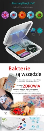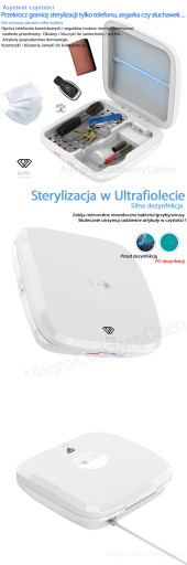 Urządzenie ALPOL które służy do dezynfekcji telefonu lub innych drobnych przedmiotów za pomocą promieni UV. Promienie UV zabijają nawet do 99,9% bakterii i wirusów znajdujących się na rzeczach. Produkt posiada też funkcję szybkiego ładowania bezprzewodowego.