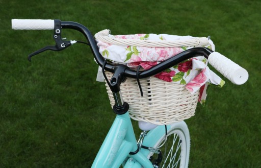 Kosz: wiklinowy biały mocowany na haki z wyściółką oraz pokrowcem na siodełko. Podaj wzór w wiadomości dla sprzedającego, w przypadku braku informacji wzór dobieramy losowo.