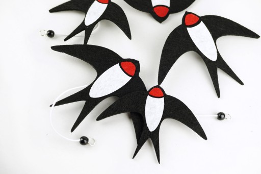 Na mobil Jaskółki składa się pięć jaskółek dymówek, które możemy spotkać wiosną i latem w naszym otoczeniu. Filcowe jaskółki zostały wykonane w różnych rozmiarach, by pomóc dziecku zrozumieć skalowanie obiektów, a dodanie czerwonego detalu powoduje, że dziecko z jeszcze większym zainteresowaniem obserwuje mobil.