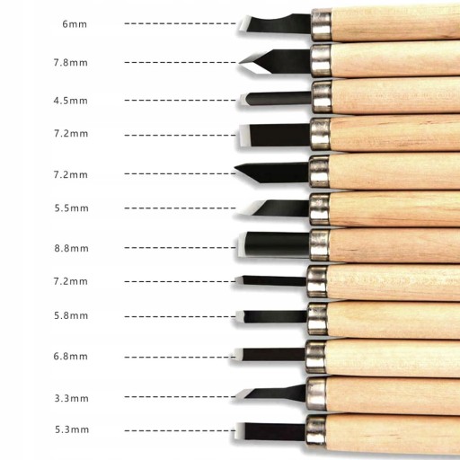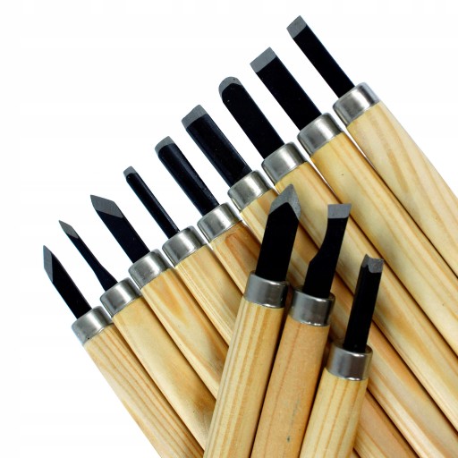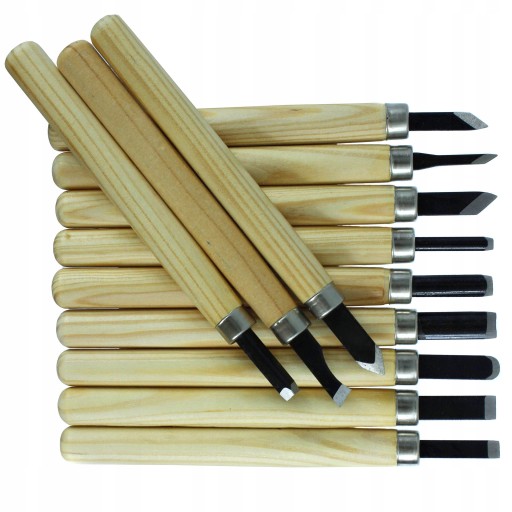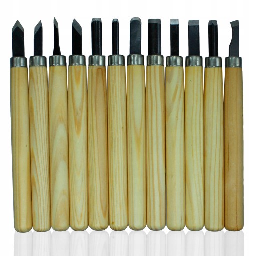 Komplet 12 rylców do drewna wyposażonych w stalowe ostrze osadzone na drewnianej rękojeści. Idealne narzędzie do rzeźbienia w drewnie, glinie, gipsie, czy podobnych miękkich materiałach. Posiadają ergonomiczne uchwyty wykonane z lakierowanego drzewa, które dobrze leżą w dłoni. Wykonane z wysokiej jakości stali podatnej na ostrzenie.