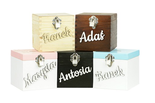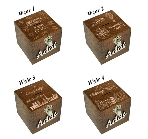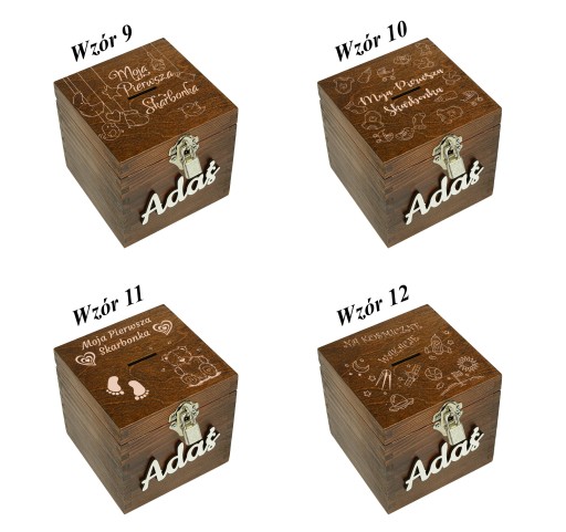- Drewnianą skarbonkę w orzechowym kolorze.