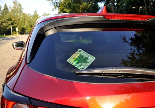 Zielony listek, który prosi o wyrozumiałość pozostałych kierowców.