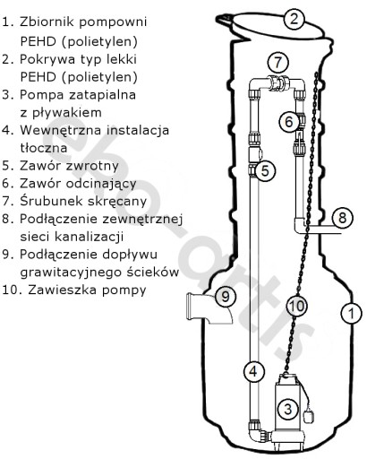 Przepompownia zawiera wszystkie elementy konieczne do prawidłowej pracy i wymaga jedynie podłączenia wlotu, wylotu oraz dostarczenia energii elektrycznej do pracy pompy.