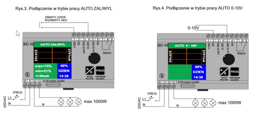3. AUTO 0-10V - sygnał poziomu oświetlenia 0-10VDC podany jest do zacisków 5,6 sterownika