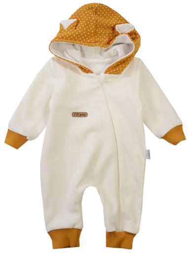 Krój: Pajacyk z kapturkiem dodatkowo podszytym bawełnianą podszewką. Zapinany po skosie na zamek. Nogawki i rękawki zakończone ściągaczem. Na przodzie ozdobna, skórzana naszywka.