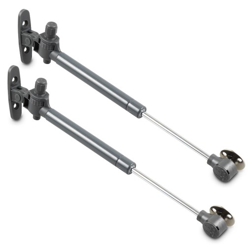 Zestaw dwóch podnośników gazowych służących do opuszczanych frontów np. w zabudowie kuchennej. Każdy podnośnik meblowy został wyposażony w mechanizm soft-close, który zwalnia front podczas zamykania i zapobiega w ten sposób nieprzyjemnemu trzaskaniu. Dodatkowym atutem tych podnośników jest możliwość regulacji momentu, w którym uruchamiany jest hamulec.