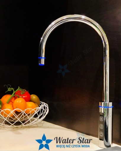 Piękne wzornictwo połączone z funkcjonalnością (trzy rodzaje wody filtrowanej) w nowoczesnym wydaniu (bateria dotykowa ze stali nierdzewnej).