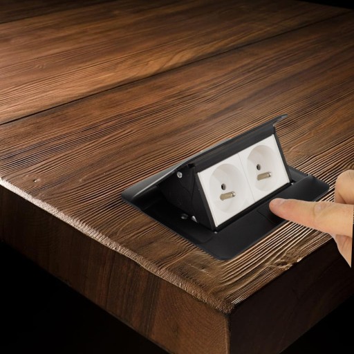 FloorBox gniazda chowane w blat. Puszka pop-up w kolorze czarnym z dwoma gniazdami z uziemieniem. System otwierania 'naciśnij i przesuń, aby uniknąć przypadkowemu otwarciu stopą. Możliwy montaż wylewce w betonowej.